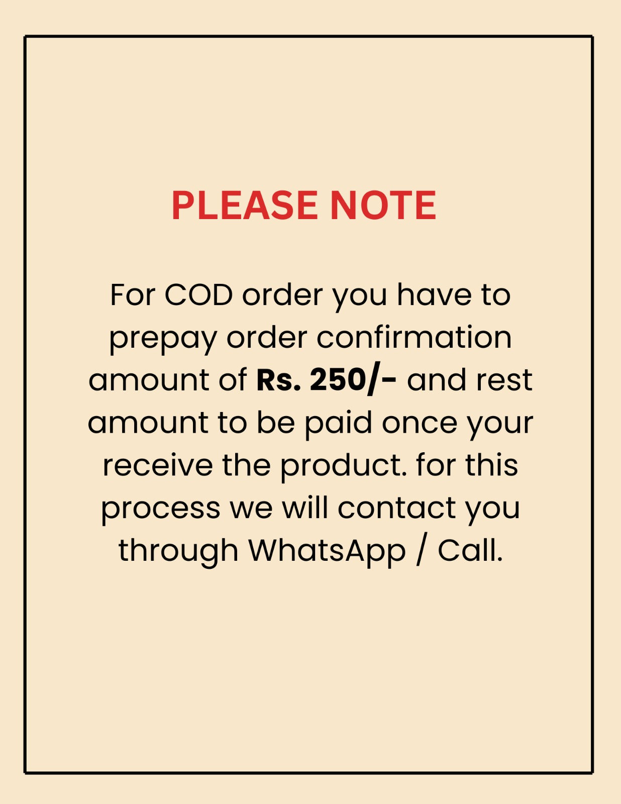 1. For COD order you have to prepay order confirmation amount of Rs. 250/- and rest amount to be paid once your receive the product. for this process we will contact you through WhatsApp / Call.