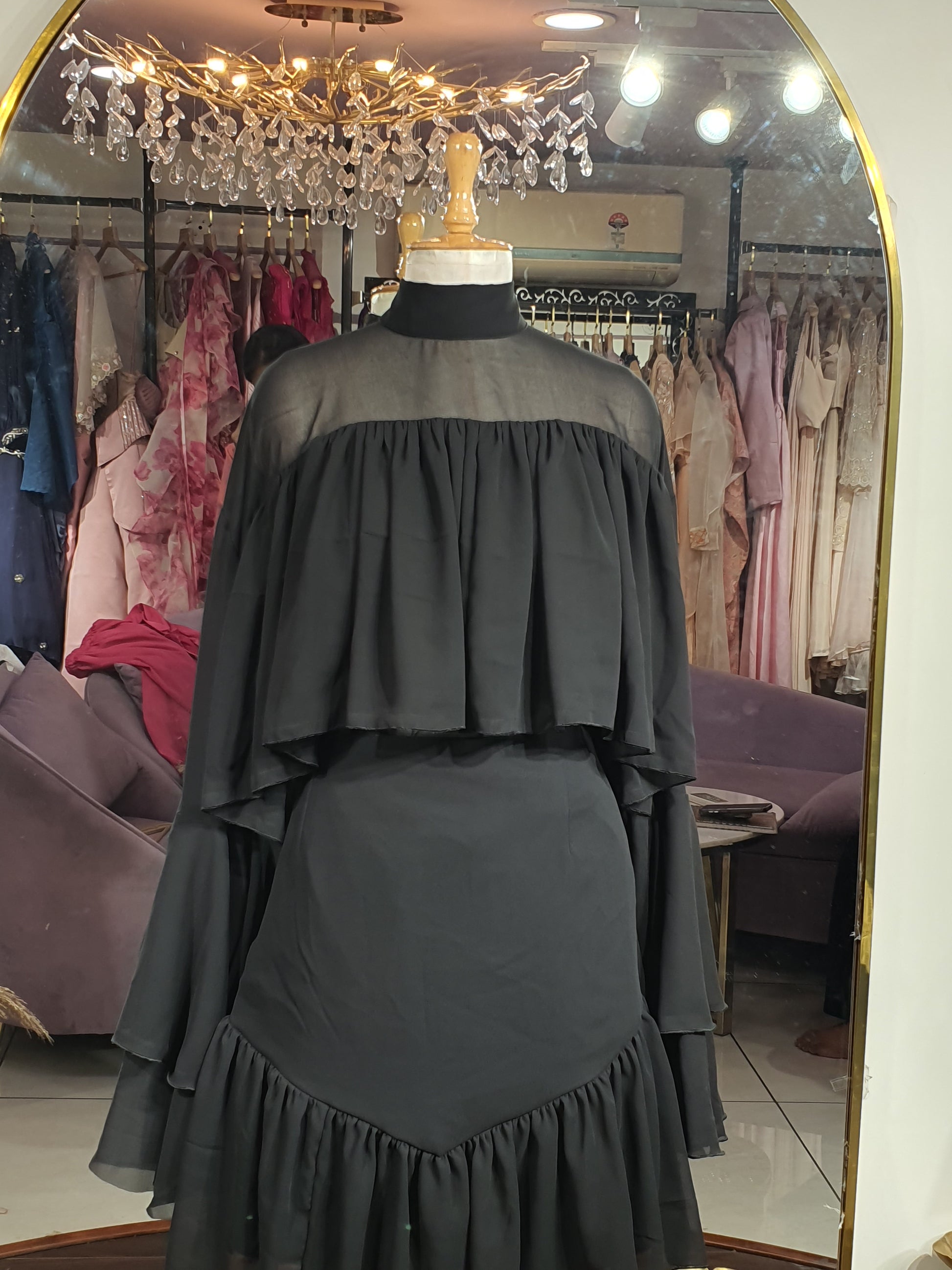 Styling Details: High neck ruffle detailing top with yoke pattern mini skirt