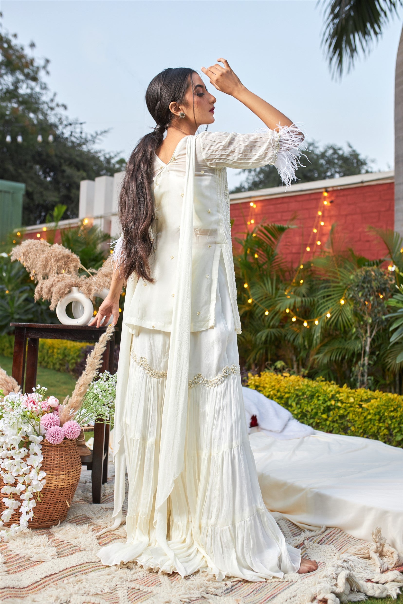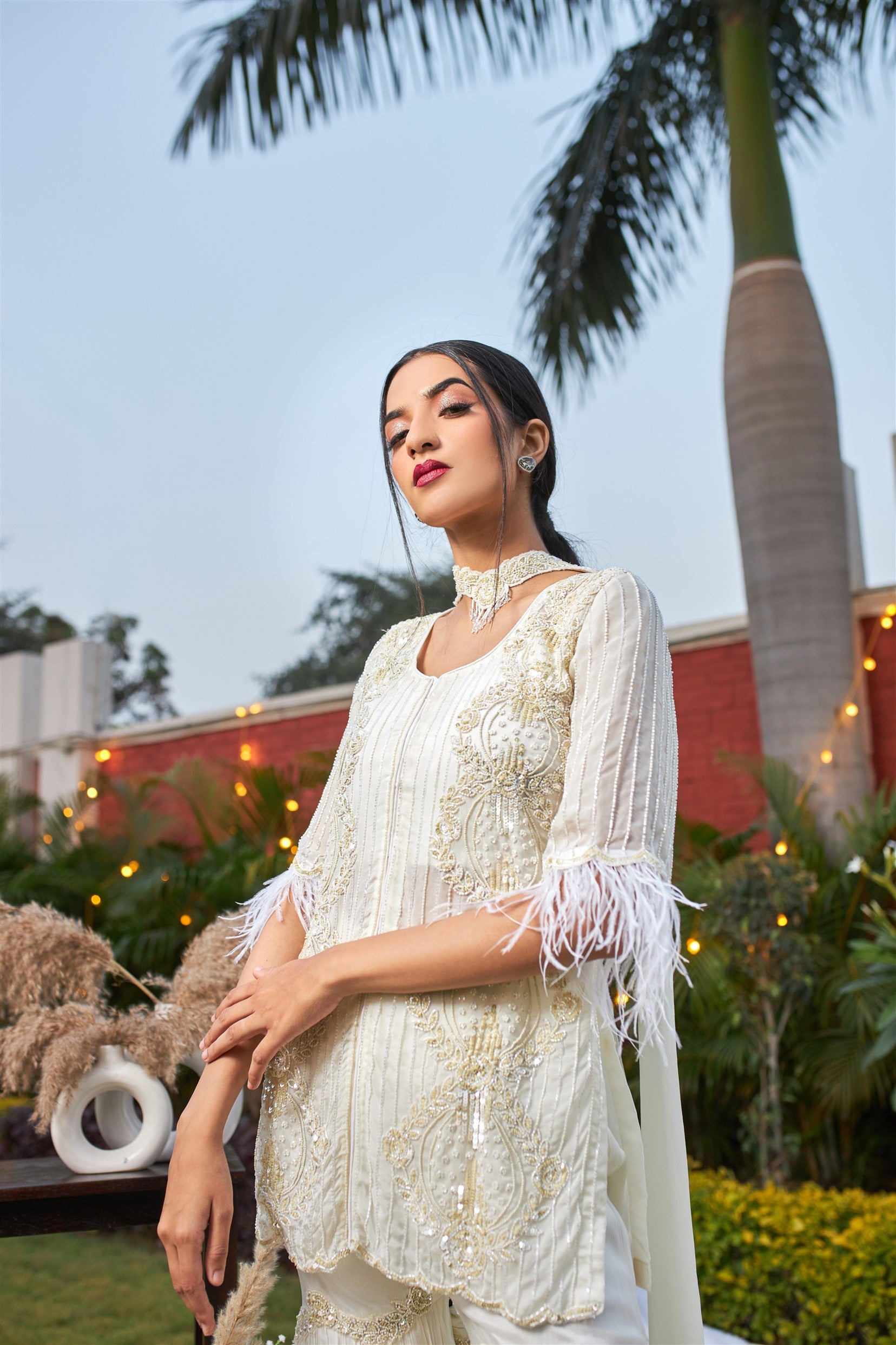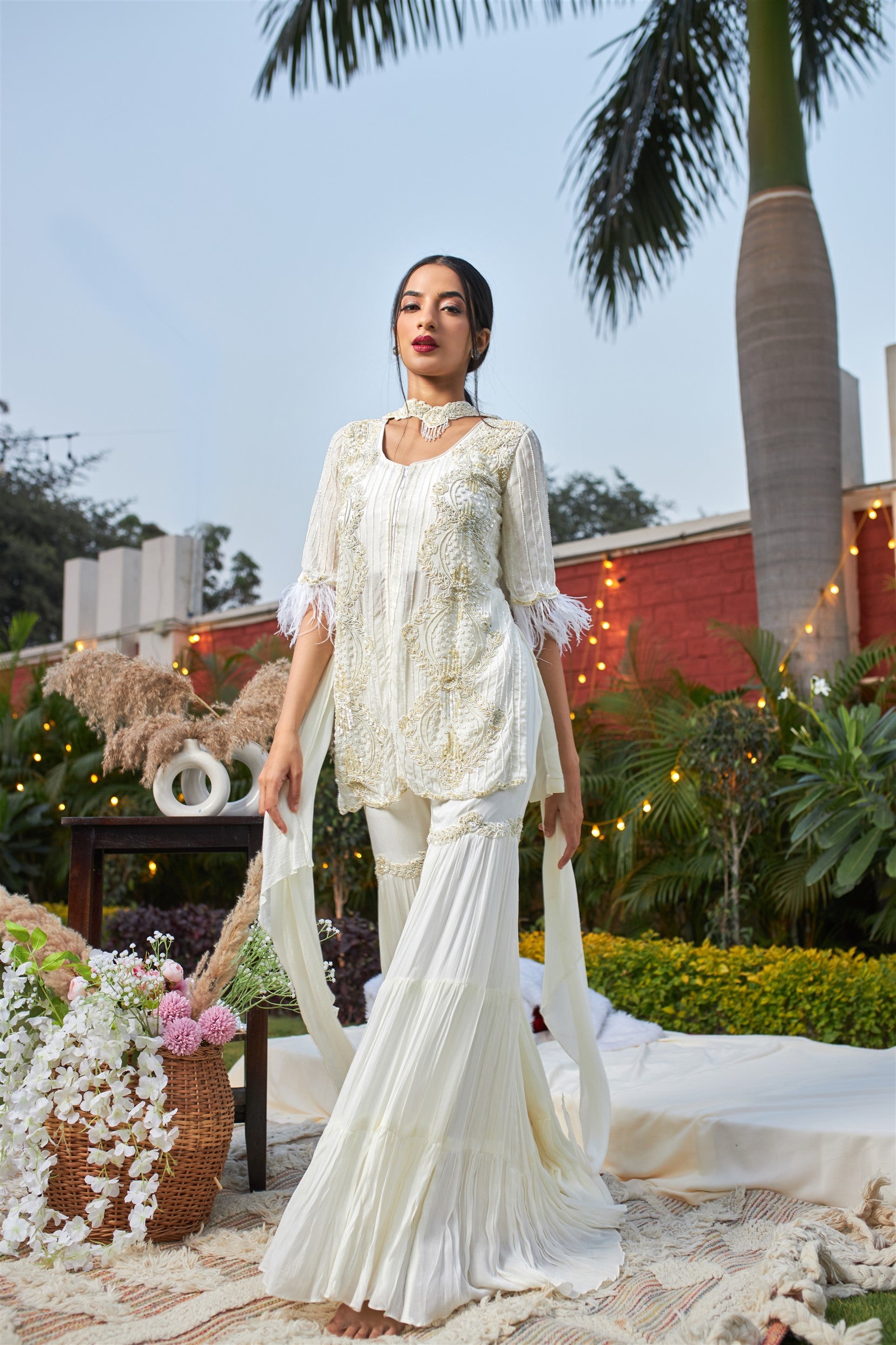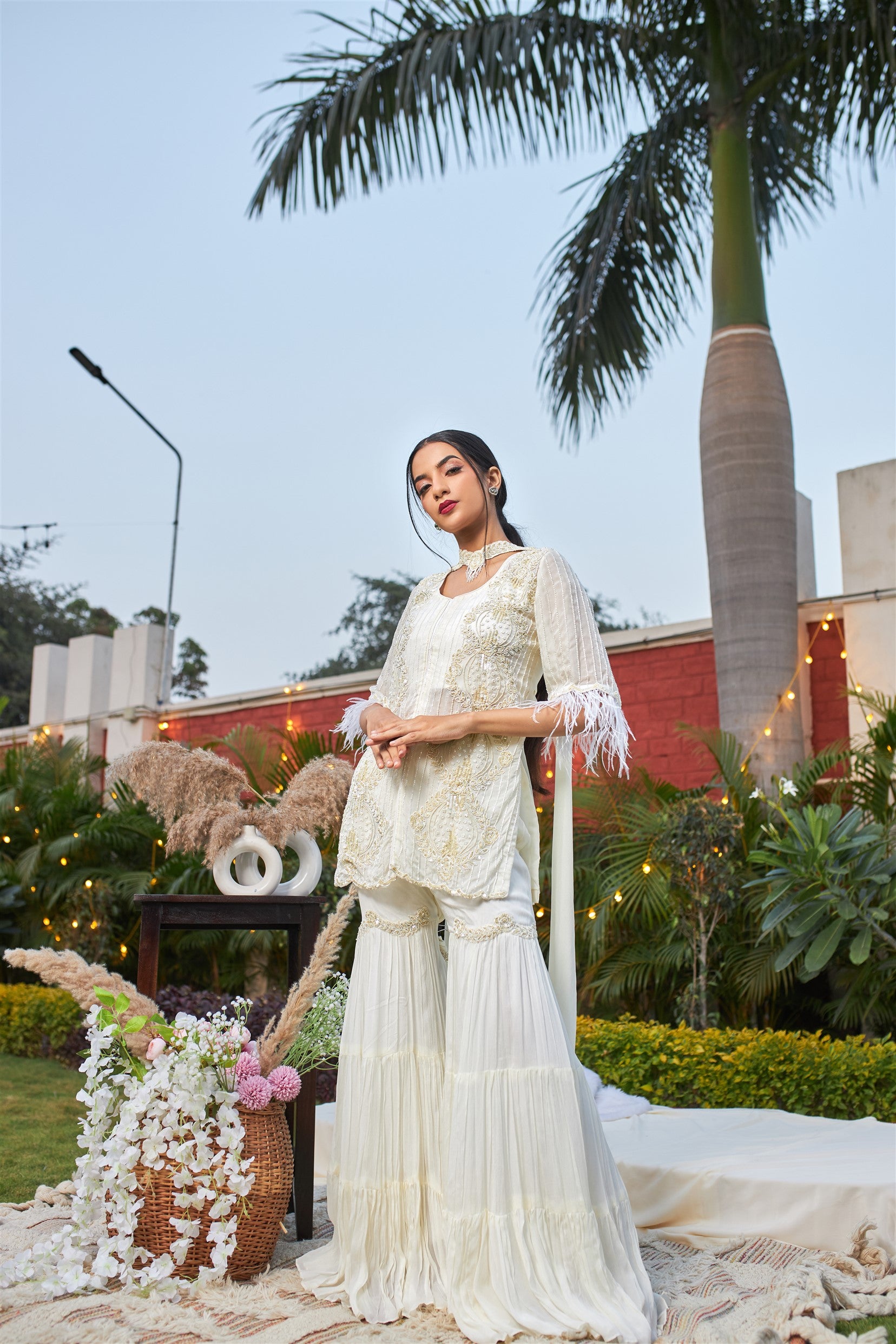 Styling Details: Organza full embellished kurta with chinon sharara and choker dupatta