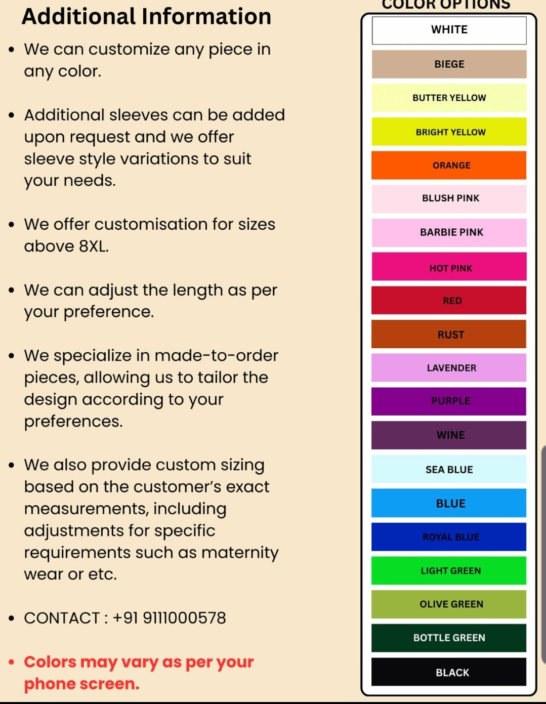 4.The length of the outfit depends on the size so please ask us for more information on +91 9111000578.