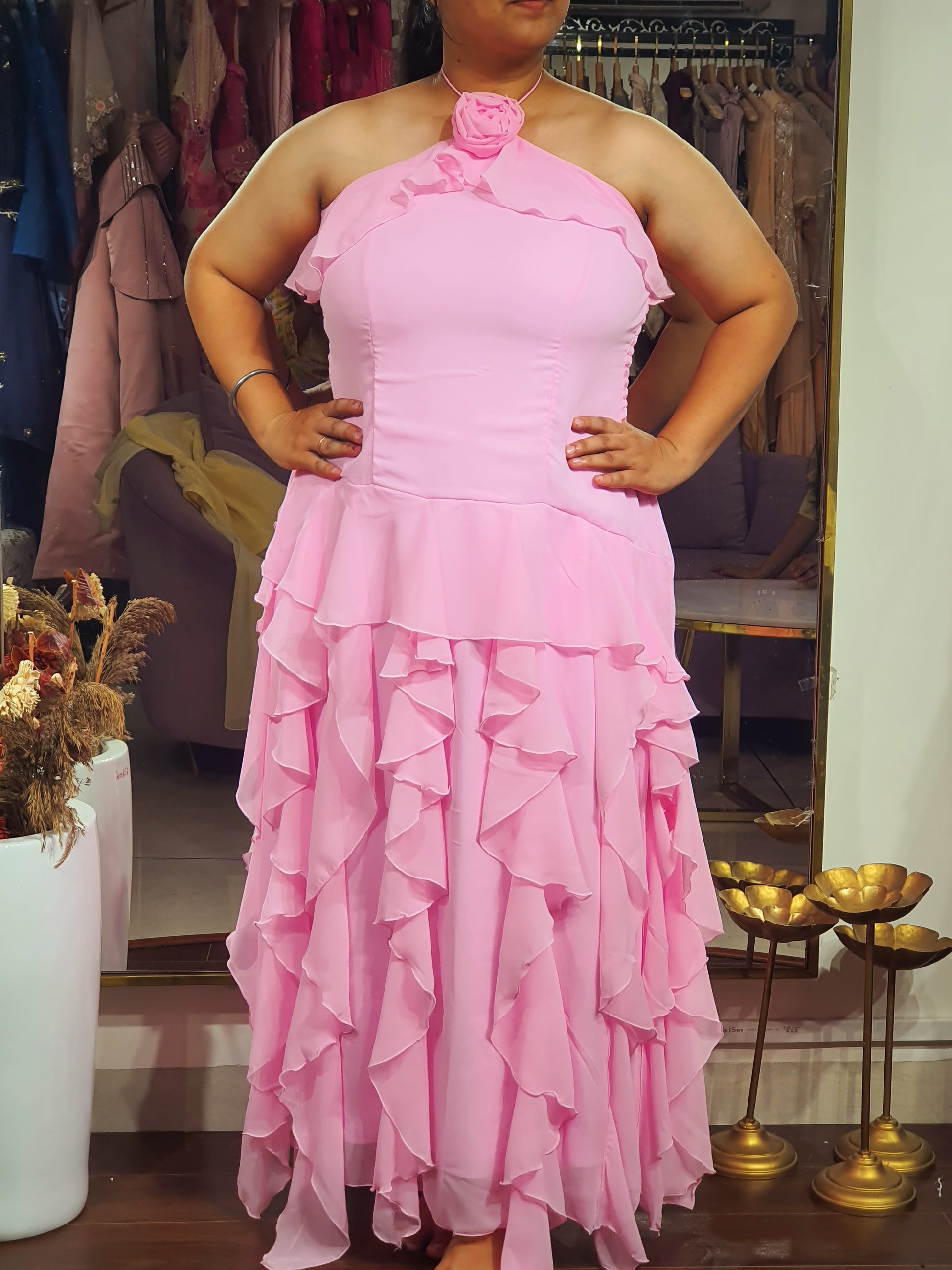 Styling Details: Halter Neck Long Ruffle Dress With Back Knot with 3D flowers detailing