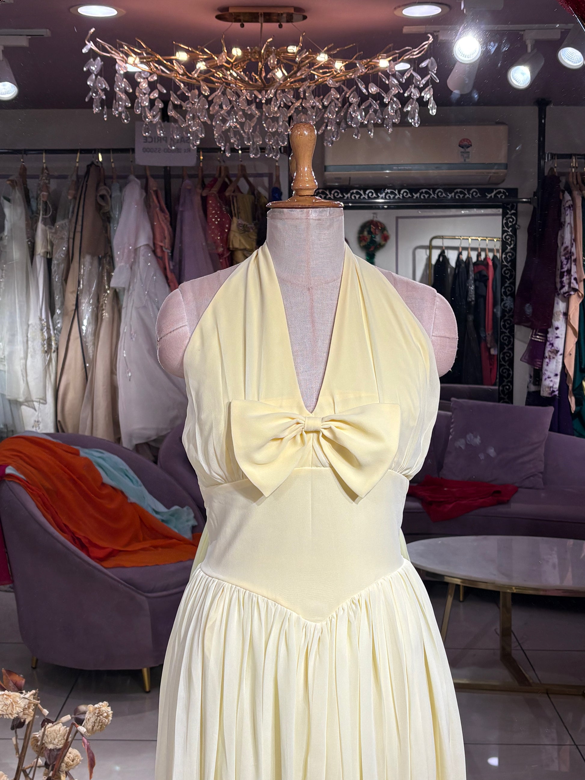 Styling Details: Long Dress with 3D bow detailing at neck comes up in gatheres detailing