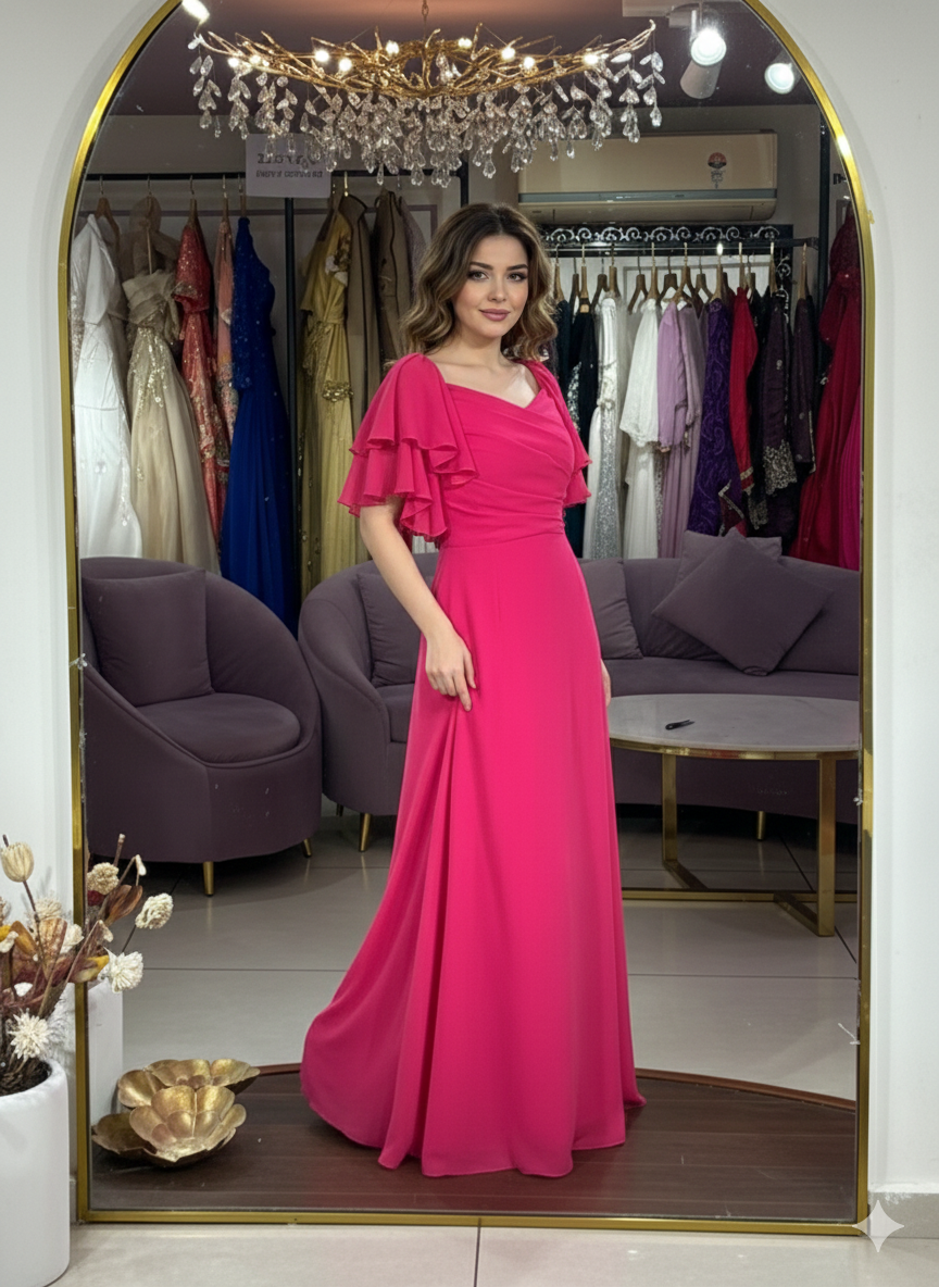 Styling Details: An flared maxi dress with Ruffle detailing sleeves and pleats detailing upper body