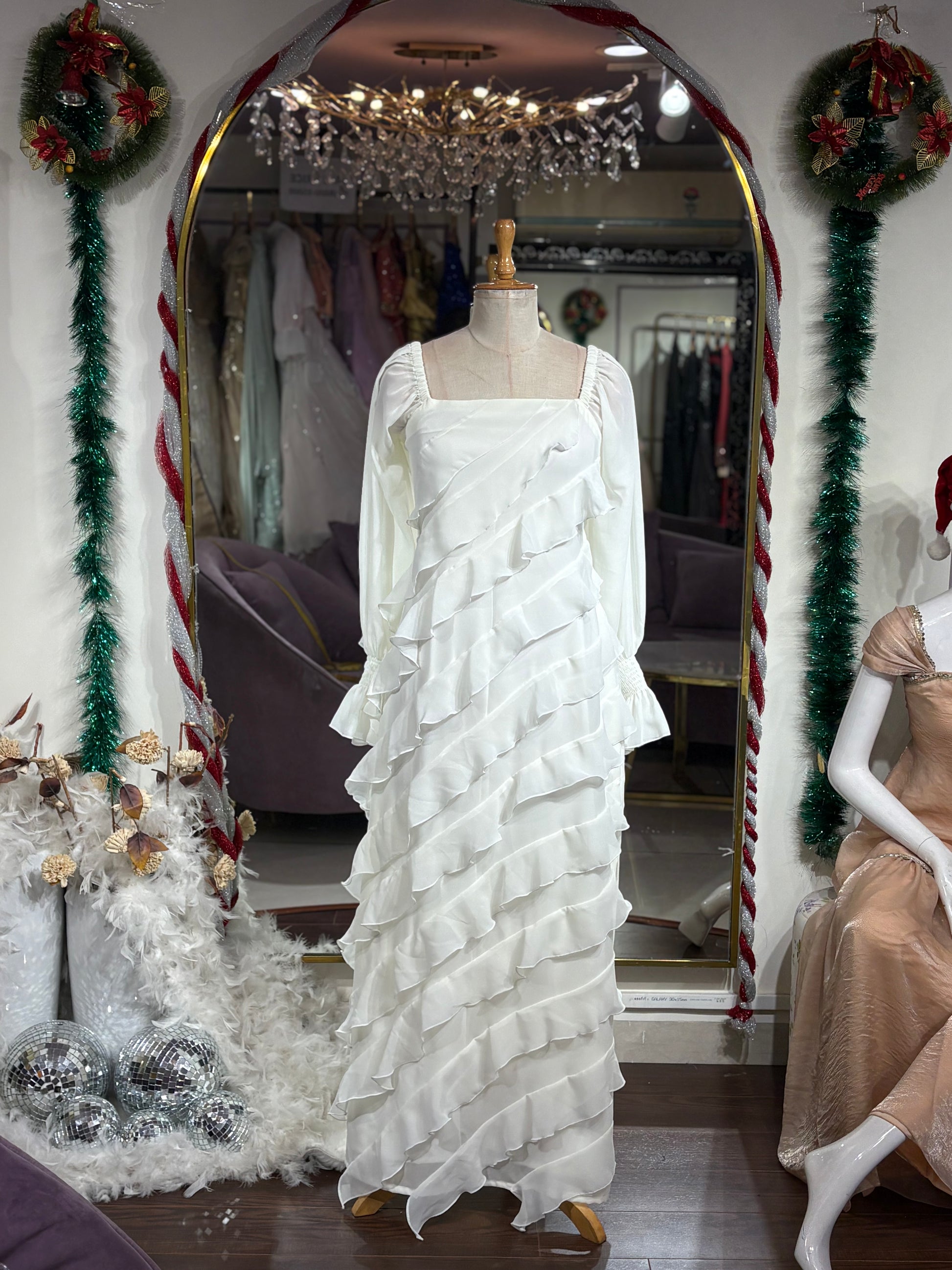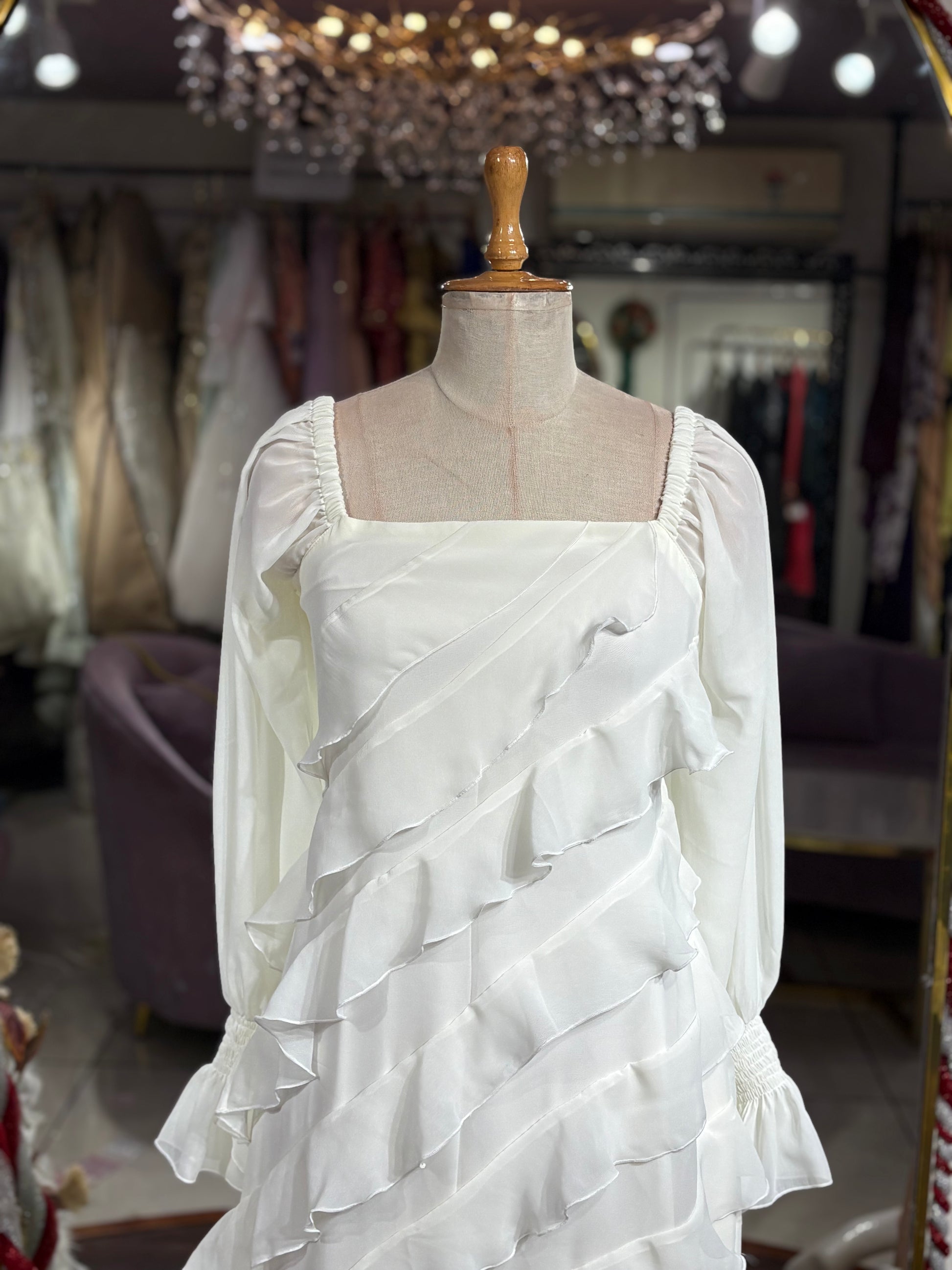 Styling Details: Georgette maxi ruffle dress with Puff sleeves and side slit