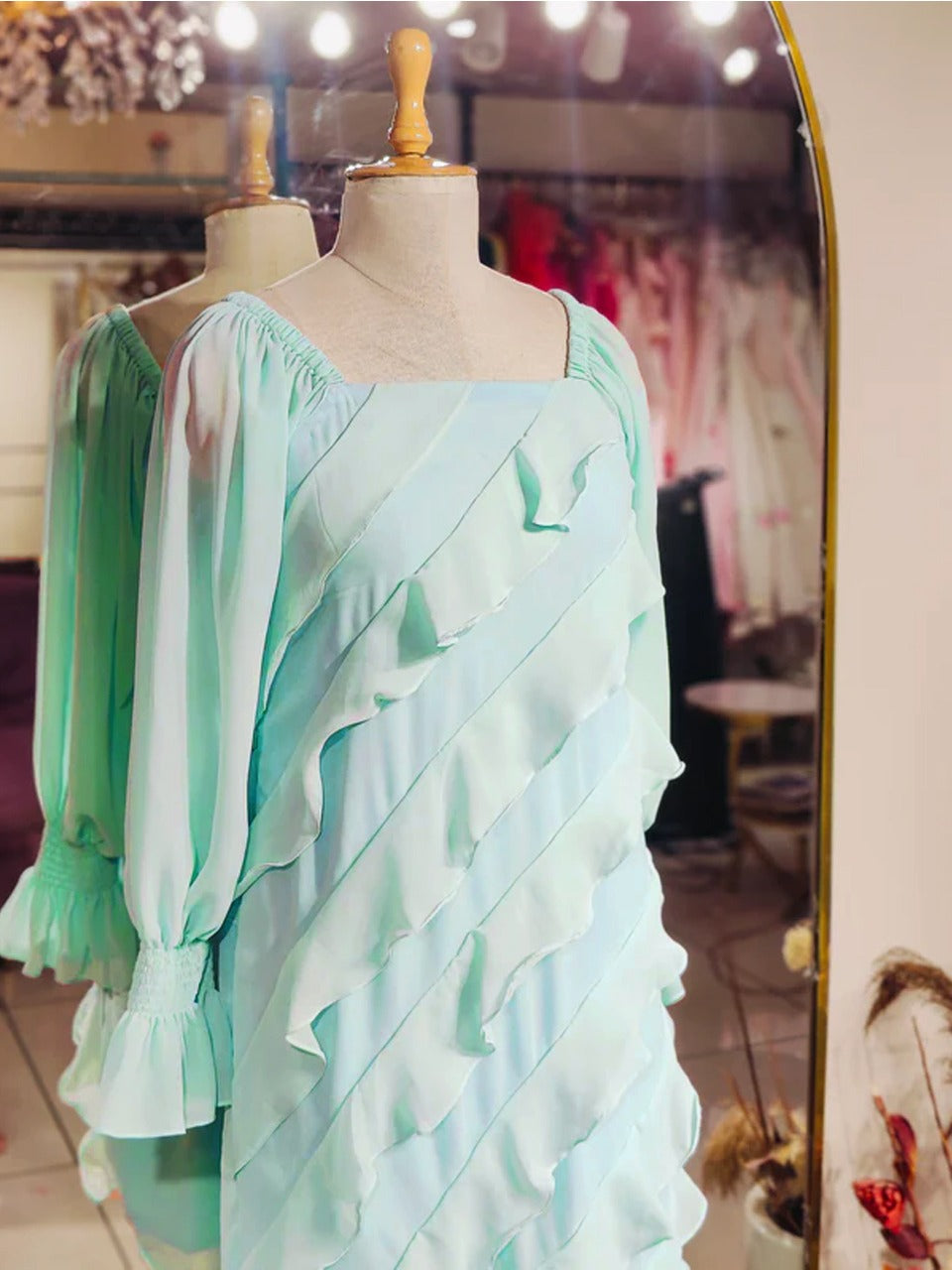 Styling Details: Georgette short ruffle dress with puff sleeves