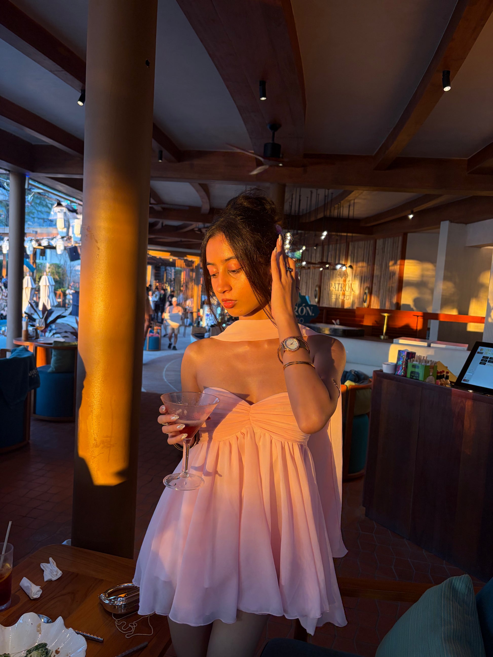 Styling Details: Mini tube dress with gatheres detailing paired up with stole