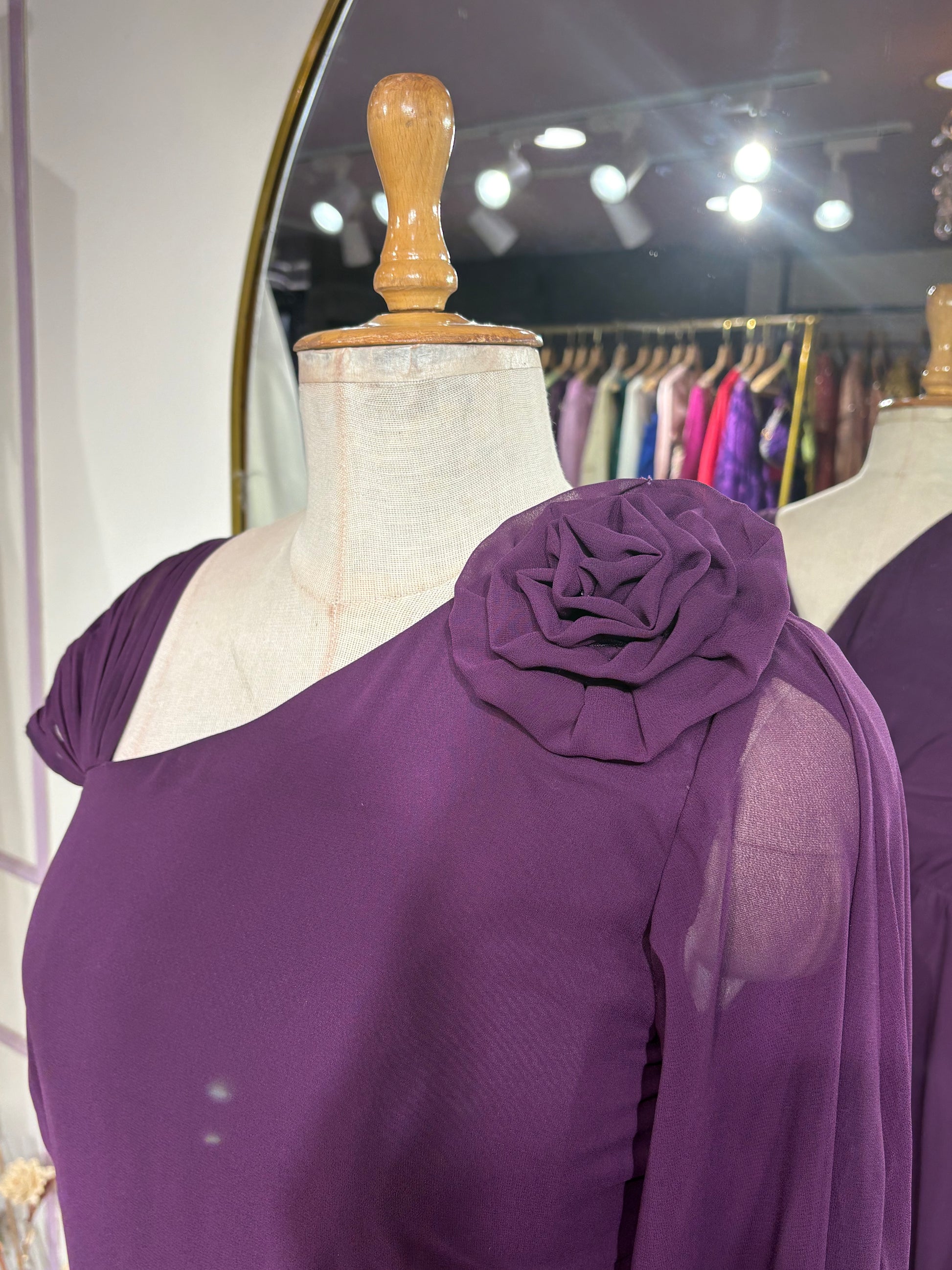 Styling Details: Long A-line Dress with Flap detailing cape sleeves comes up with 3d flower