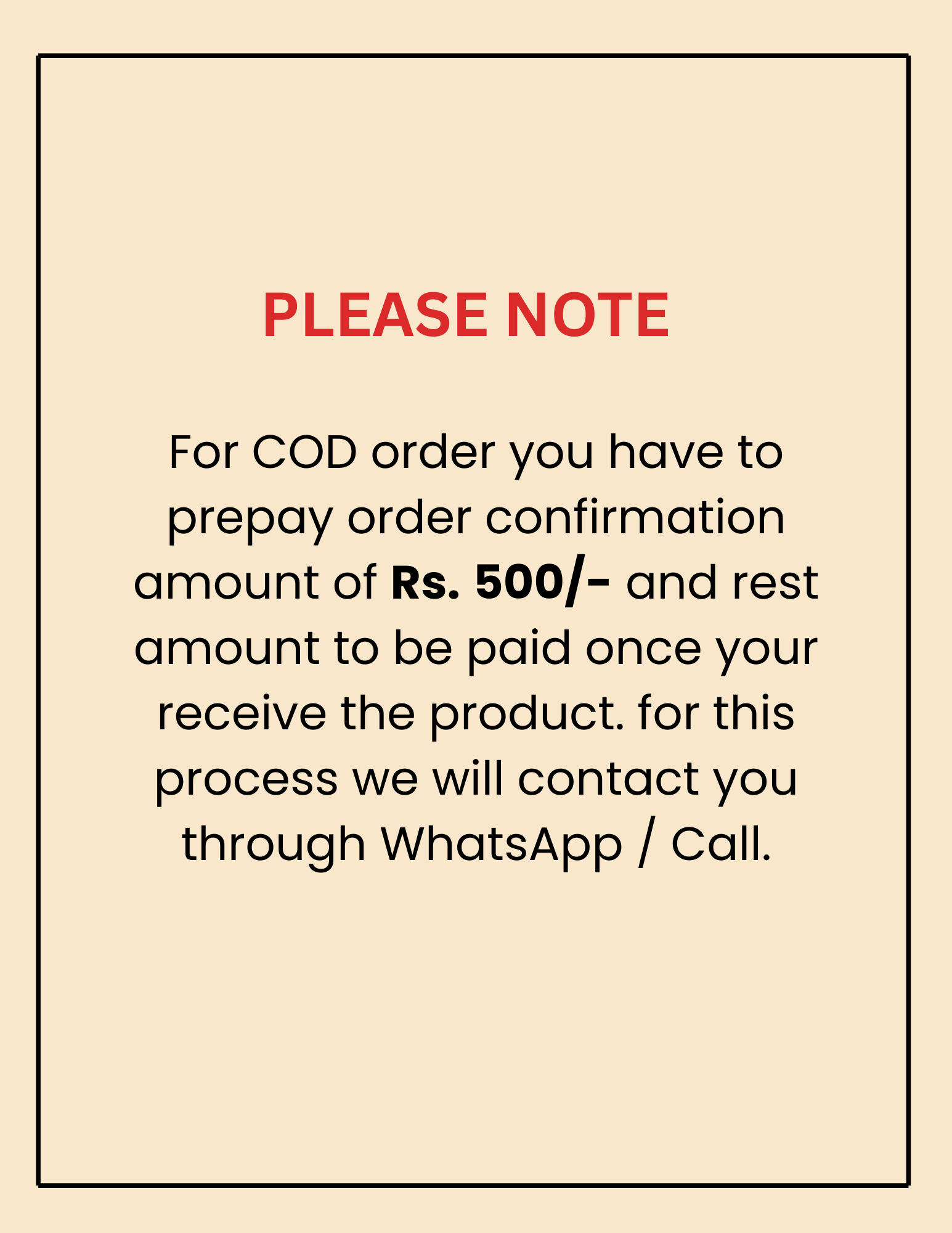 1. For COD order you have to prepay order confirmation amount of Rs. 500/- for each outfit and rest amount to be paid once your receive the product. for this process we will contact you through WhatsApp / Call.